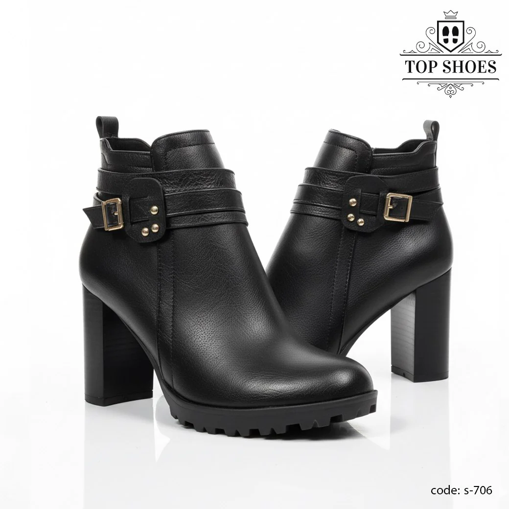 هاف بوت S-706 تحفة فاخرة — تصميمه الأنثوي القوي مع الحزام المعدني الذهبي والكعب العالي يجعل منه قطعة أيقونية في كوليكشن شتاء 2026 من Top Shoes.